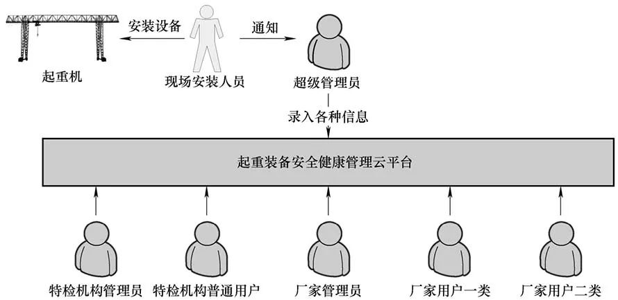 从图9可知起重装备安全健康管理云平台的参与者分别是超级管理员、特检机构管理员、特检机构普通用户、厂家管理员、厂家用户一类/二类。五种参与者的具体功能如下:
