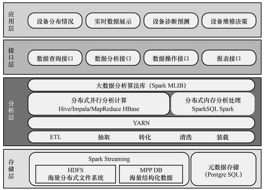 通过对起重机各种数据源和起重机健康管理特性分析,需要对起重机特征工程数据、视频数据、天气数据、实时业务监测数据和其他应用数据进行采集和分析处理。利用大数据采集、存储、分析、挖掘技术,从起重机采集到的海量数据中挖掘、提炼关键信息,建立安全、故障信息关联分析监测模型,及时洞察和响应起重机运行状态,实现起重机安全、健康和故障预测。经过以上分析,满足分布式计算、实时流计算、非结构化数据处理的大数据平台可以分为四层,分别是应用层、接口层、分析层和存储层,它们的关键技术和技术特征如图7所示。