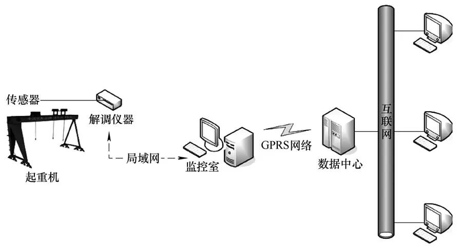 起重机健康监测硬件系统包括传感模块、数据集成、数据传输、数据中心以及云平台。传感模块采用多种传感器来测量相关信息,在起重机上根据分析结果确定传感器的布设位置,多种传感器信息通过各自的解调仪器进行分别采集,最终汇总至监控室内的工控机。处理器收到数据后进行统计分析并以不同形式显示出来,然后数据通过GPRS模块传输到数据中心。数据中心实时接收并存储GPRS模块传输过来的数据,用户可以通过云平台提供的服务访问经过处理后的诊断结果。
