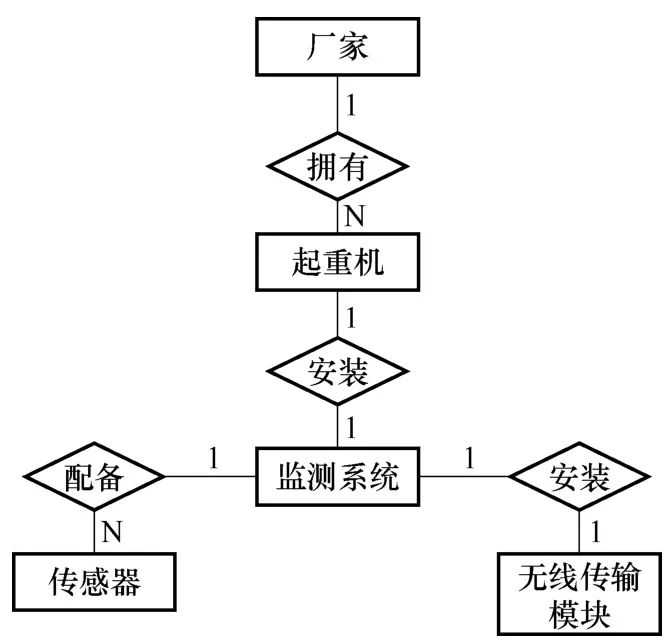 按照上述的设计划分出来的实体有厂家实体、起重机实体、监测系统实体、传感器实体和无线传输模块实体等。实体间关系的E-R图如图10所示。