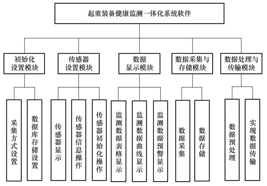 起重机健康监测系统现场应用软件将分成五大功能模块,即初始化设置模块、传感器设置模块、数据显示模块、数据采集与存储模块和数据处理与传输模块,各个功能模块下面又分别有不同的子功能模块,如图6所示。